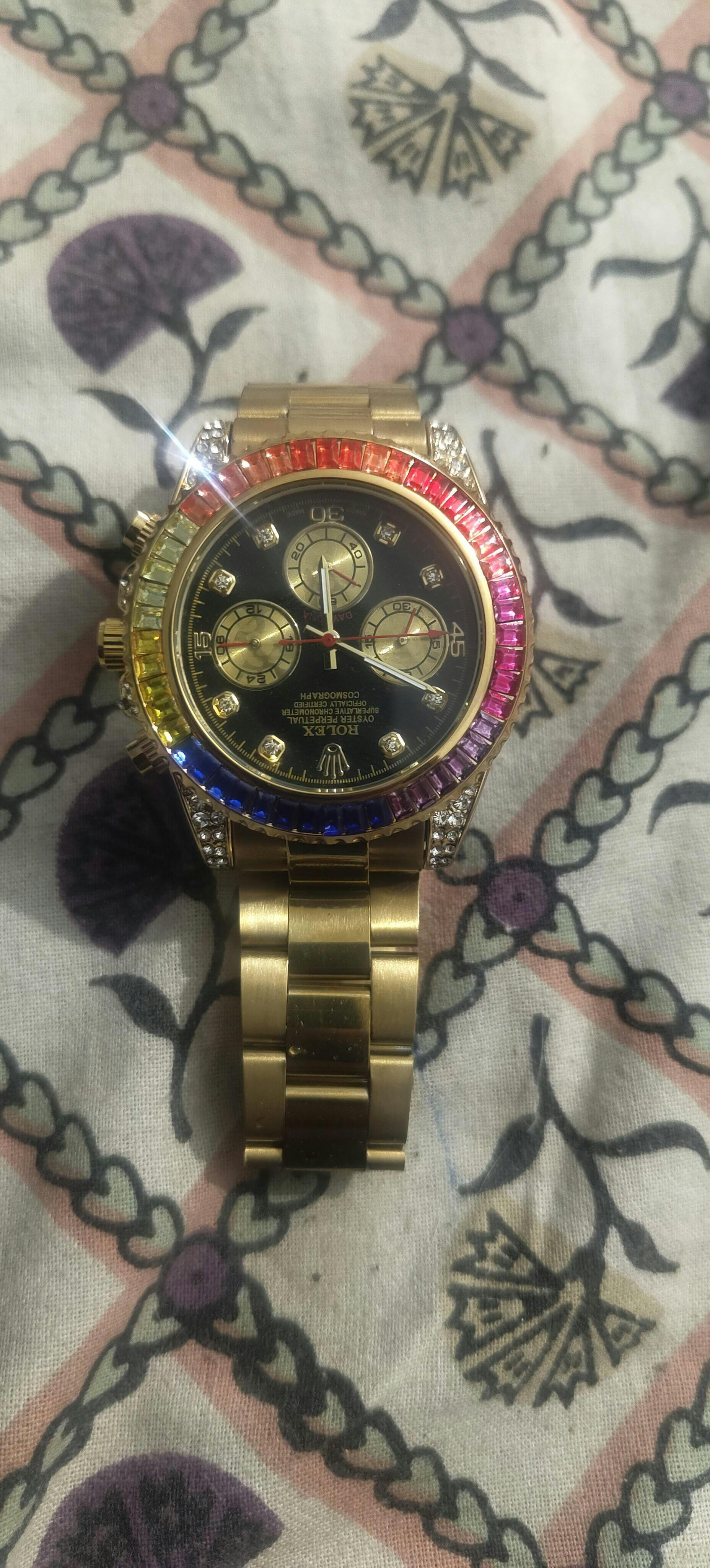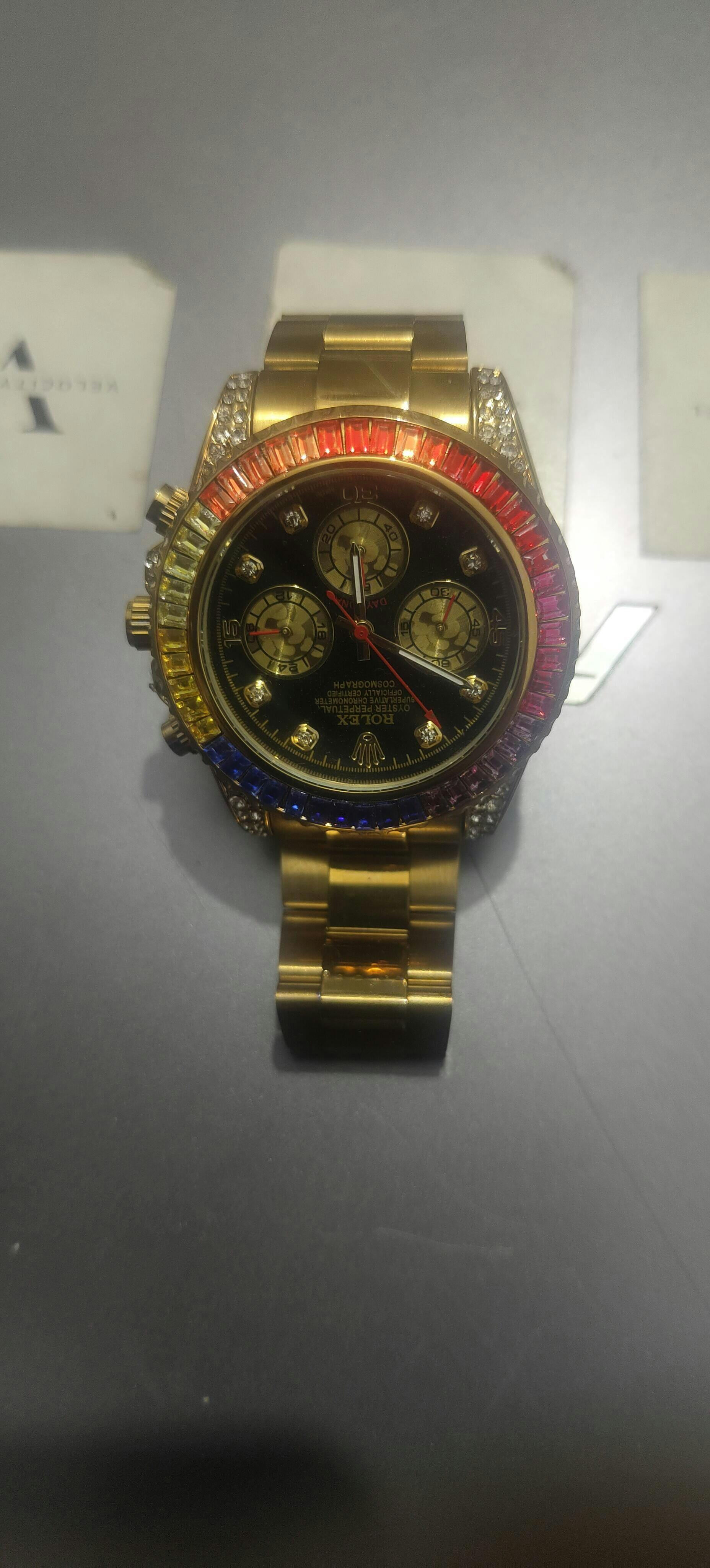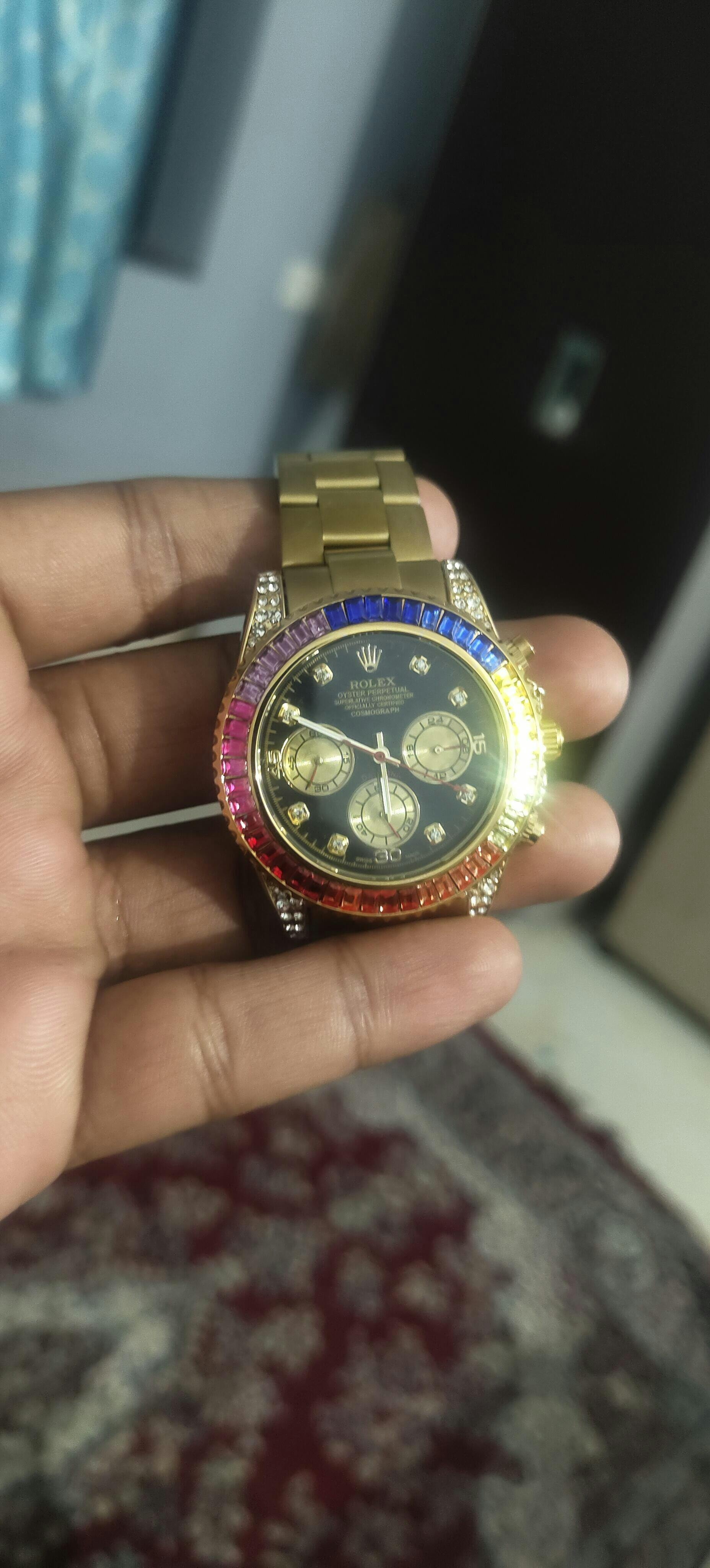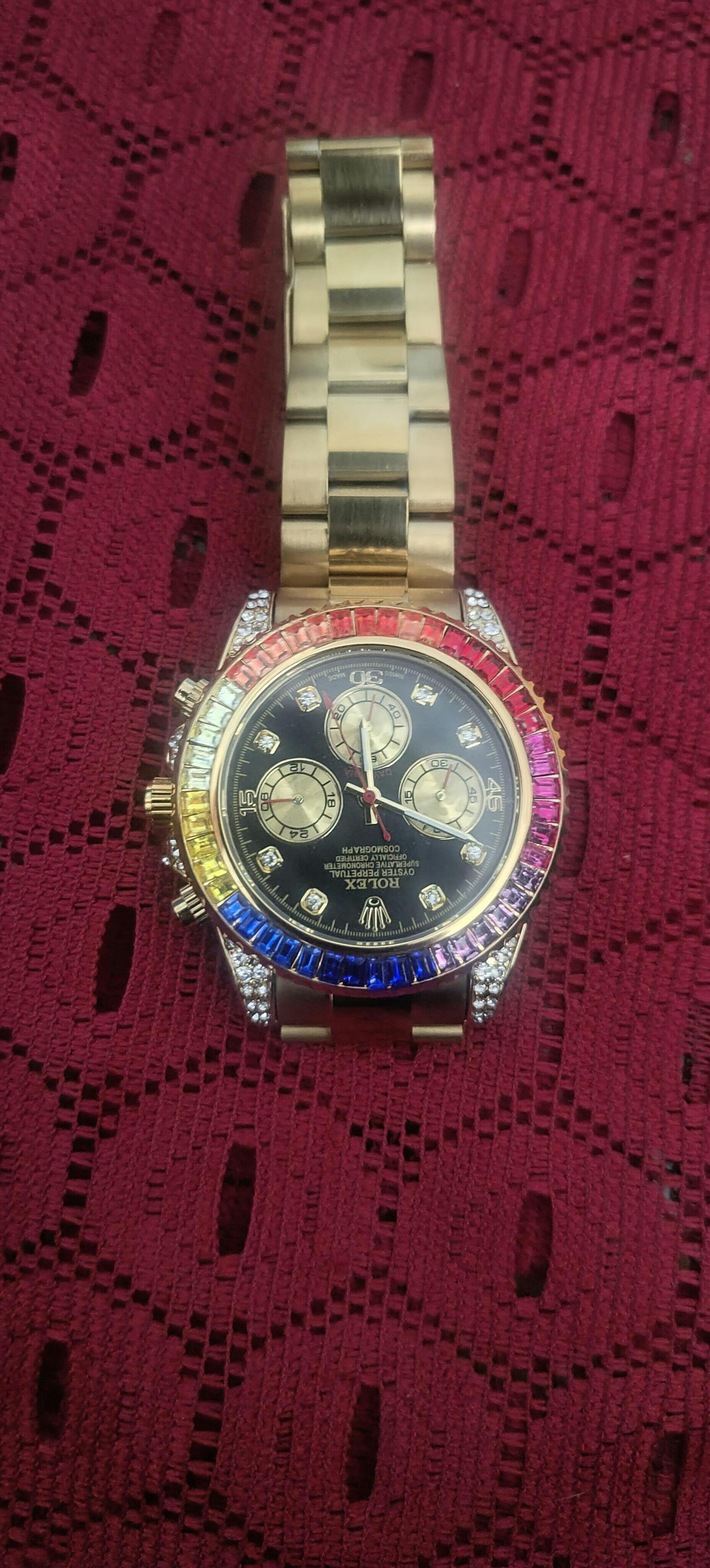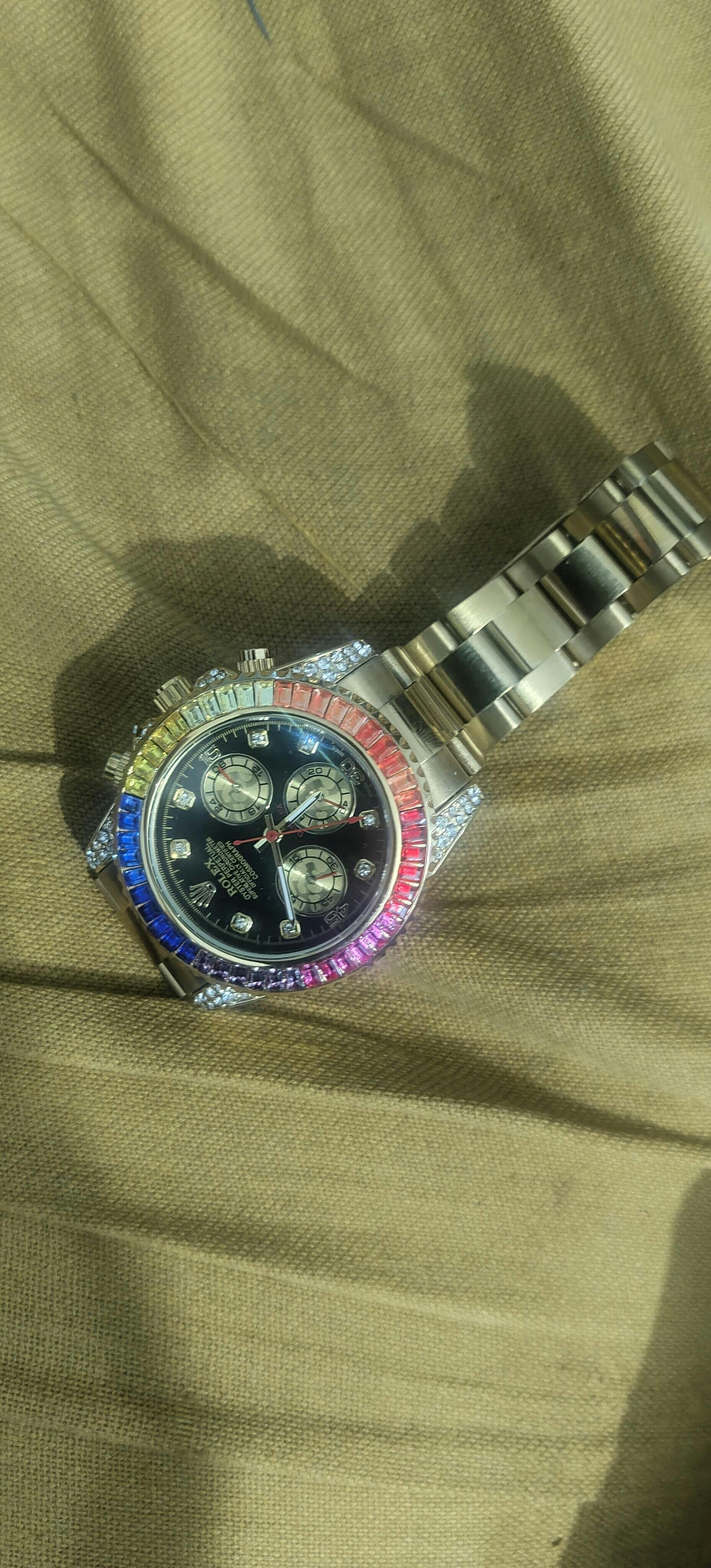 * Dial: Black with rainbow-colored sapphires surrounding the subdials